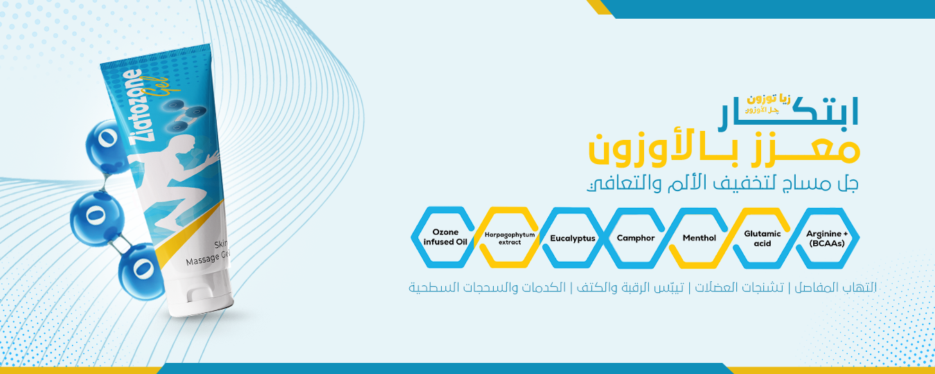 زياتوزون جل الأوزون هو جل مساج مخصص يحتوي على زيت الزيتون مخمّر بالأوزون، والمنثول، والأوكالبتوس، والكافور، وأحماض أمينية (أرجينين، ليسين، فالين، حمض الجلوتاميك)، ومستخلص جذور Harpagophytum (النبات المخلبي). يعمل على تخفيف آلام العضلات، والمفاصل، والإرهاق بعد التمرين من خلال أربعة آليات فعّالة: